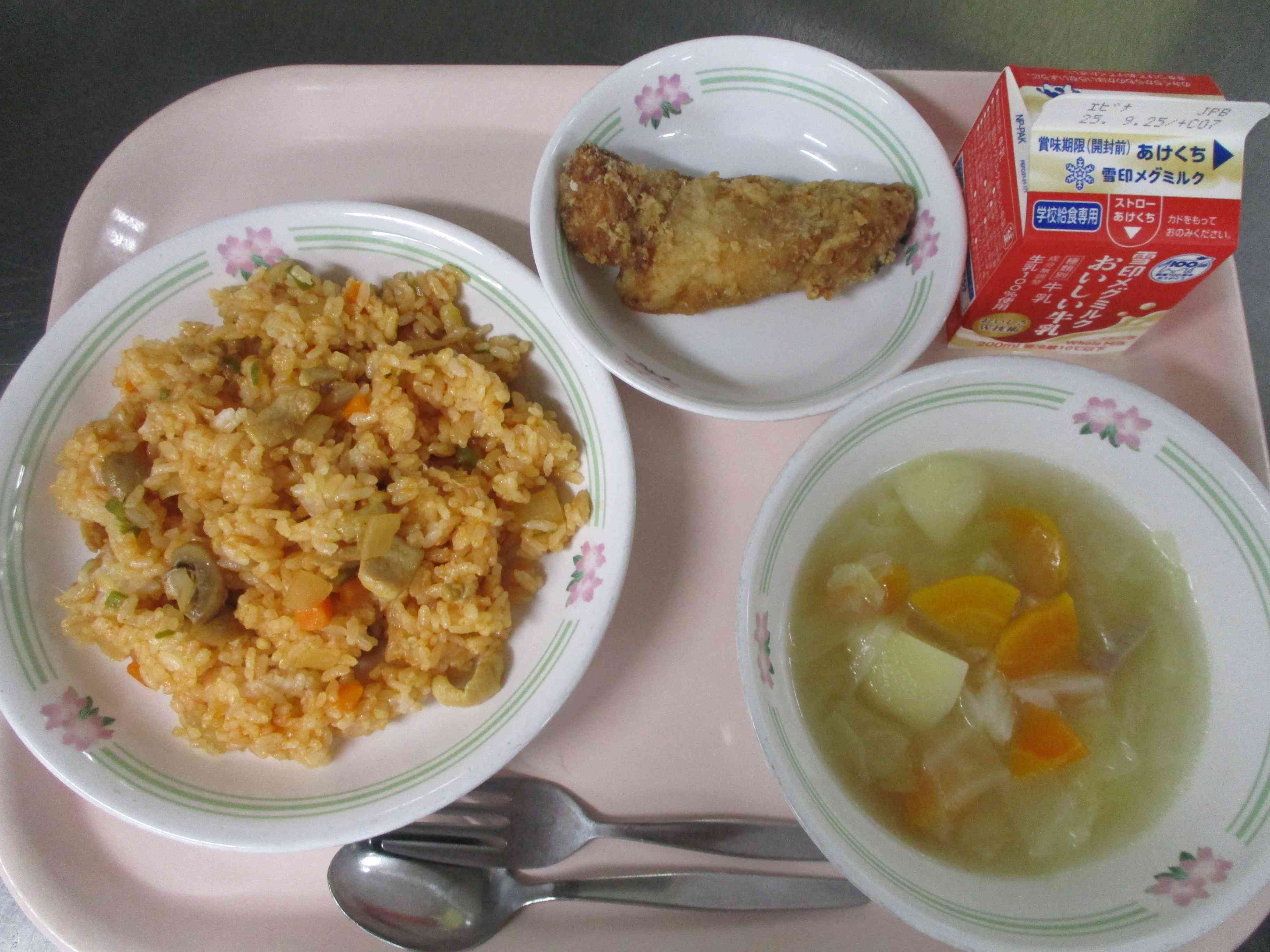<献立> ・チキンライス ・フライドフィッシュ ・野菜スープ ・牛乳 <主な食材産地> キャベツ(群馬)にんじん(北海道)にんにく(青森)ピーマン(茨城)たまねぎ(佐賀)じゃがいも(千葉)鶏肉(国産) 鶏ガラ(国産)豚骨(国産)牛乳(神奈川、千葉、栃木、群馬、岩手、静岡、北海道)