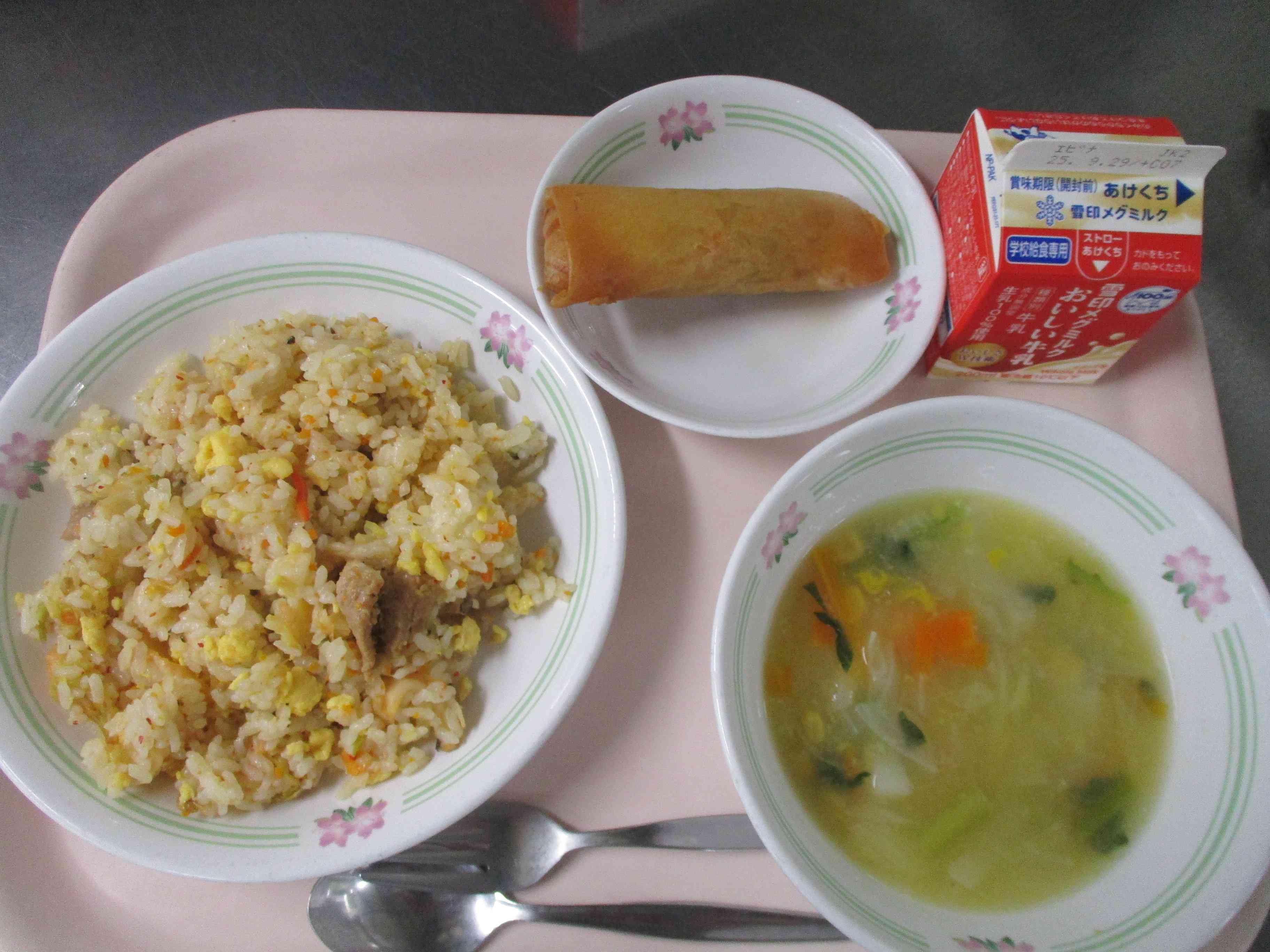 <献立> ・キムチチャーハン ・春巻き ・中華コーンスープ ・牛乳 <主な食材産地> キャベツ(青森)小松菜(茨城)しょうが(熊本)にんじん(北海道)ねぎ(秋田)たまねぎ(佐賀)たまご(青森)豚肉(国産)鶏ガラ(国産)豚骨(国産)牛乳(神奈川、千葉、栃木、群馬、岩手、静岡、北海道)