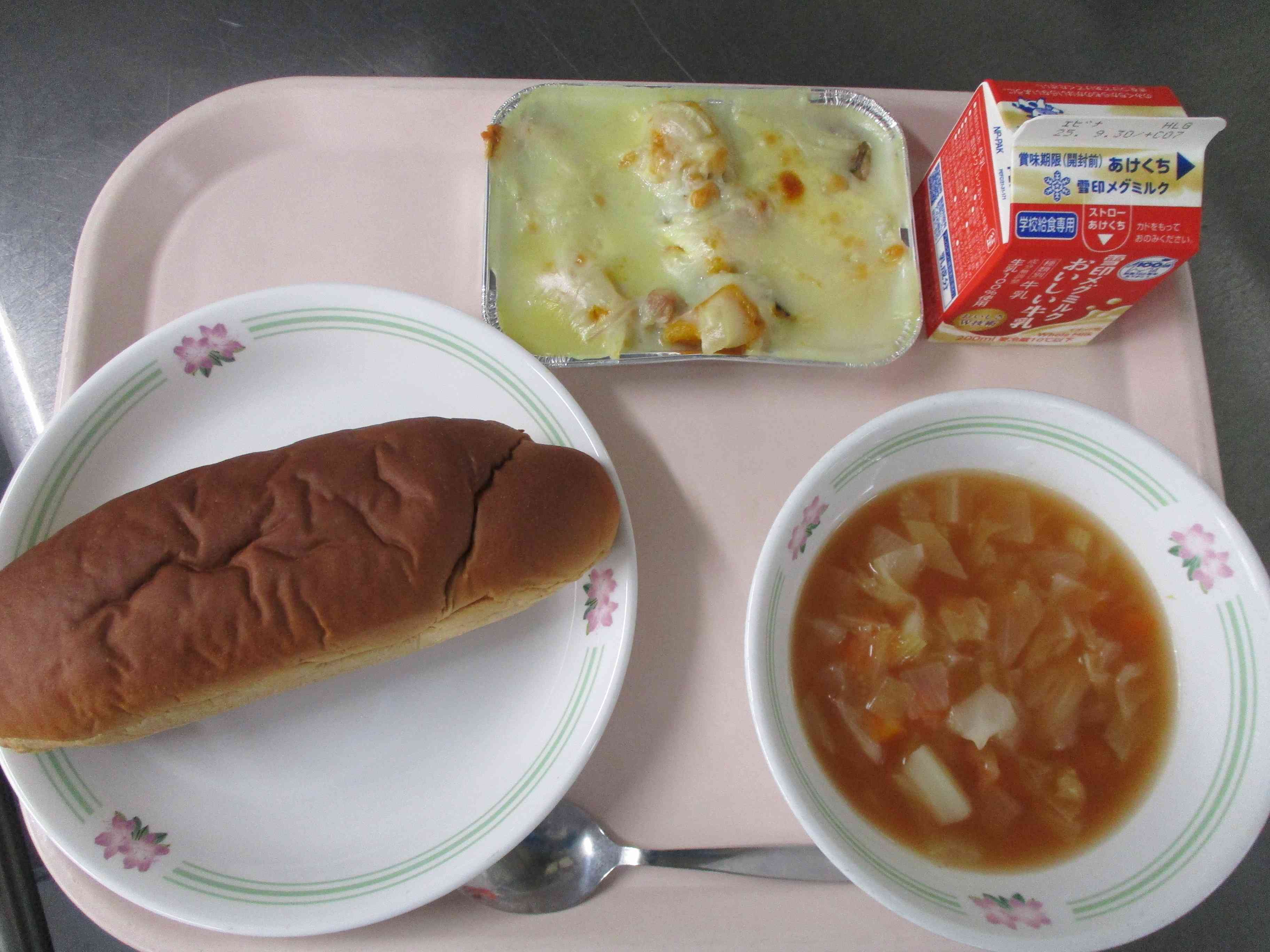 <献立> ・黒砂糖パン ・パンプキングラタン ・ミネストローネ ・牛乳 <主な食材産地> かぼちゃ(北海道)キャベツ(青森)セロリ(茨城)にんじん(北海道)たまねぎ(佐賀)鶏肉(国産)鶏ガラ(国産)豚骨(国産)牛乳(神奈川、千葉、栃木、群馬、岩手、静岡、北海道)