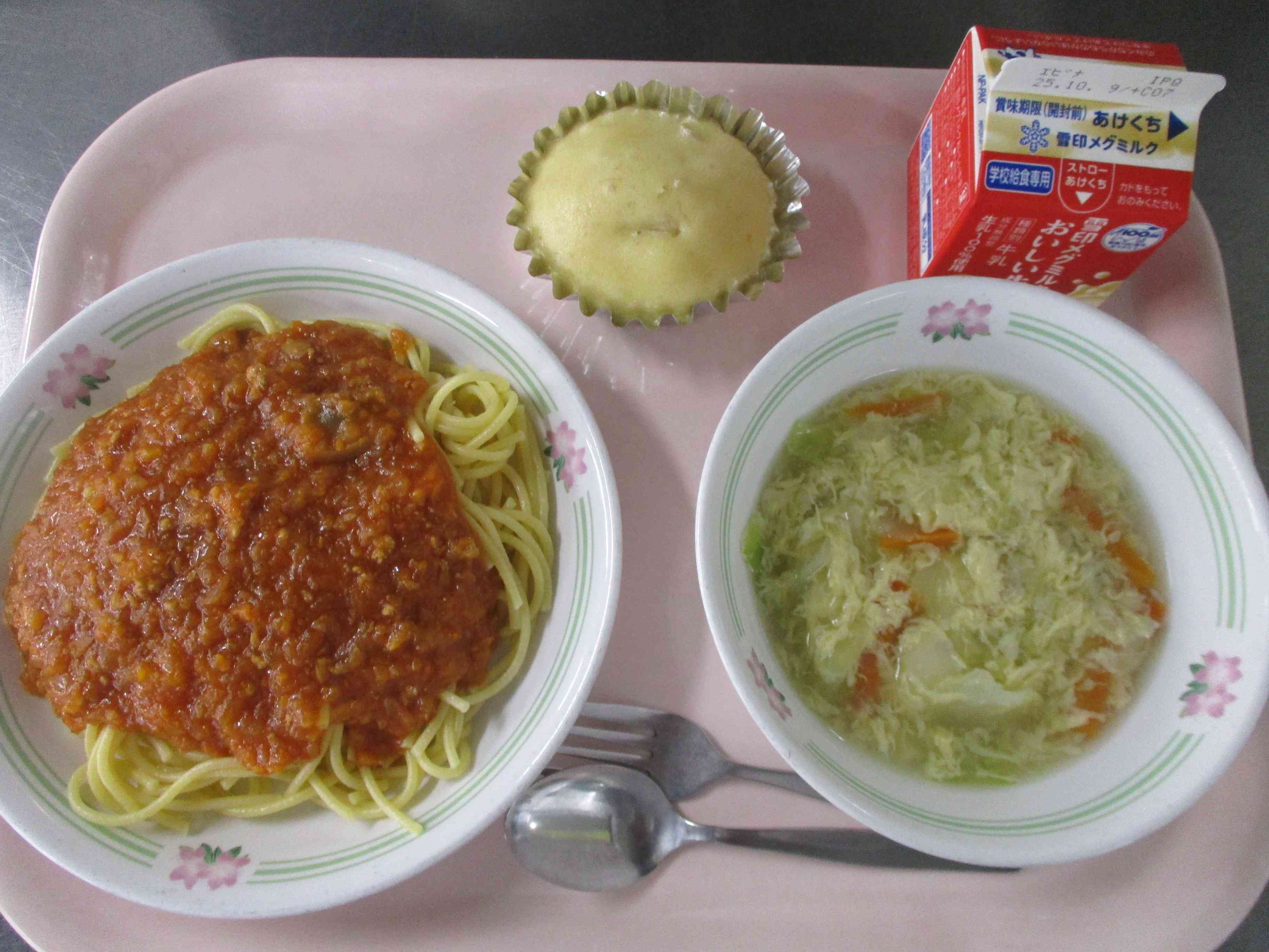 <献立> ・スパゲティミートソース ・洋風たまごスープ ・バナナケーキ ・牛乳 <主な食材産地> キャベツ(群馬)しょうが(高知)にんじん(北海道)にんにく(青森)たまねぎ(佐賀)バナナ(フィリピン)豚肉(国産)鶏ガラ(国産)豚骨(国産)牛乳(神奈川、千葉、栃木、群馬、岩手、静岡、北海道)