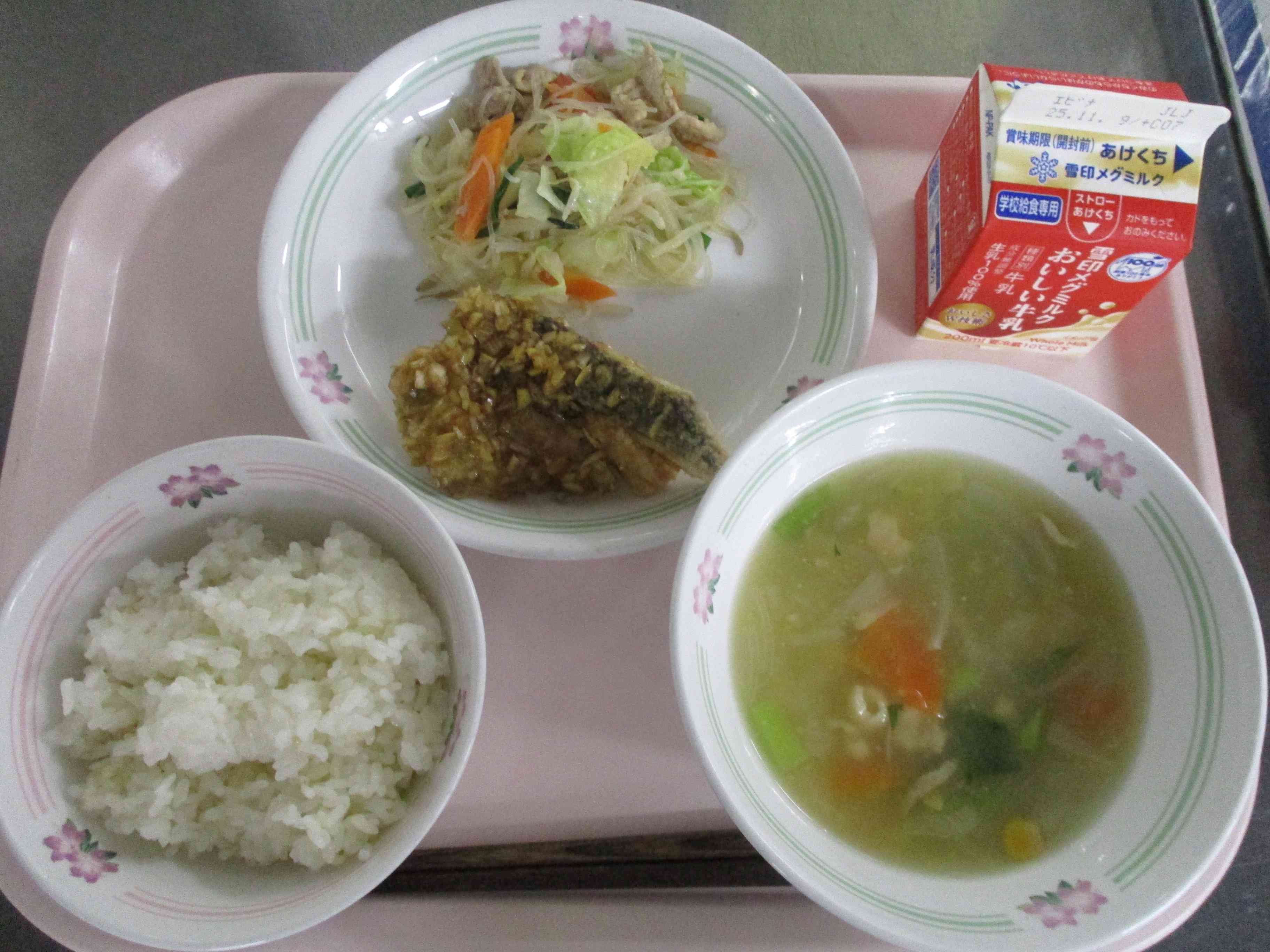 <献立> ・ごはん ・魚の香味あげ ・チャーホーサイ ・中華コーンスープ ・牛乳 <主な食材産地> 豚肉(国産)鶏肉(国産)鶏ガラ(国産)豚骨(国産)キャベツ(長野)小松菜(東京)しょうが(高知)たまねぎ(兵庫)にら(茨城)にんじん(北海道)にんにく(青森)ねぎ(青森)もやし(青森)牛乳(神奈川、千葉、栃木、群馬、宮城、山形、秋田、岩手、静岡、新潟、富山、北海道)