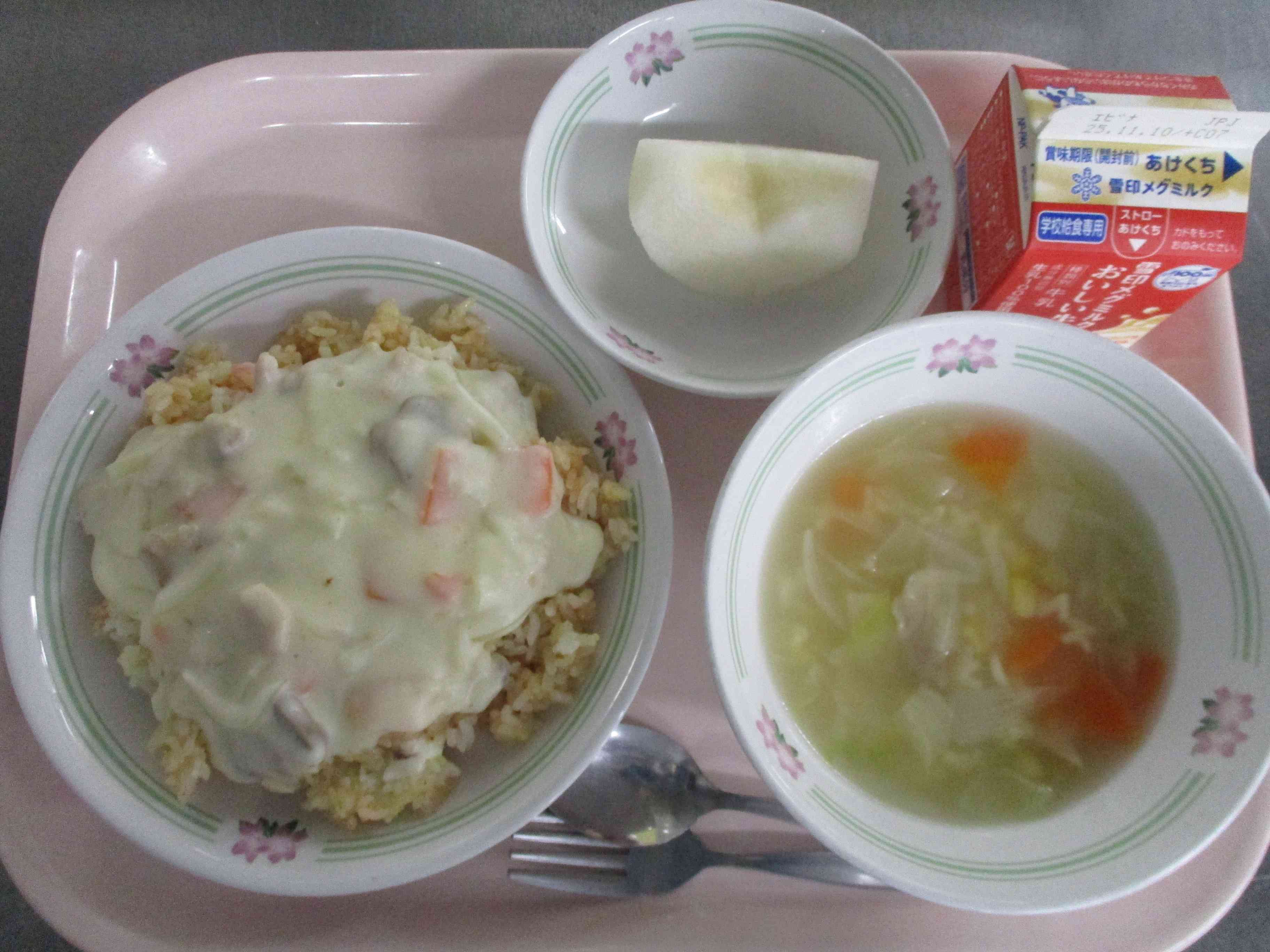 <献立> ・ケチャップライスホワイトソースがけ ・マカロニスープ ・梨 ・牛乳 <主な食材産地> キャベツ(愛知)たまねぎ(兵庫)にんじん(北海道)鶏肉(国産)鶏ガラ(国産)豚骨(国産)梨(宮城)牛乳(神奈川、千葉、栃木、群馬、宮城、山形、秋田、岩手、静岡、新潟、富山、北海道)