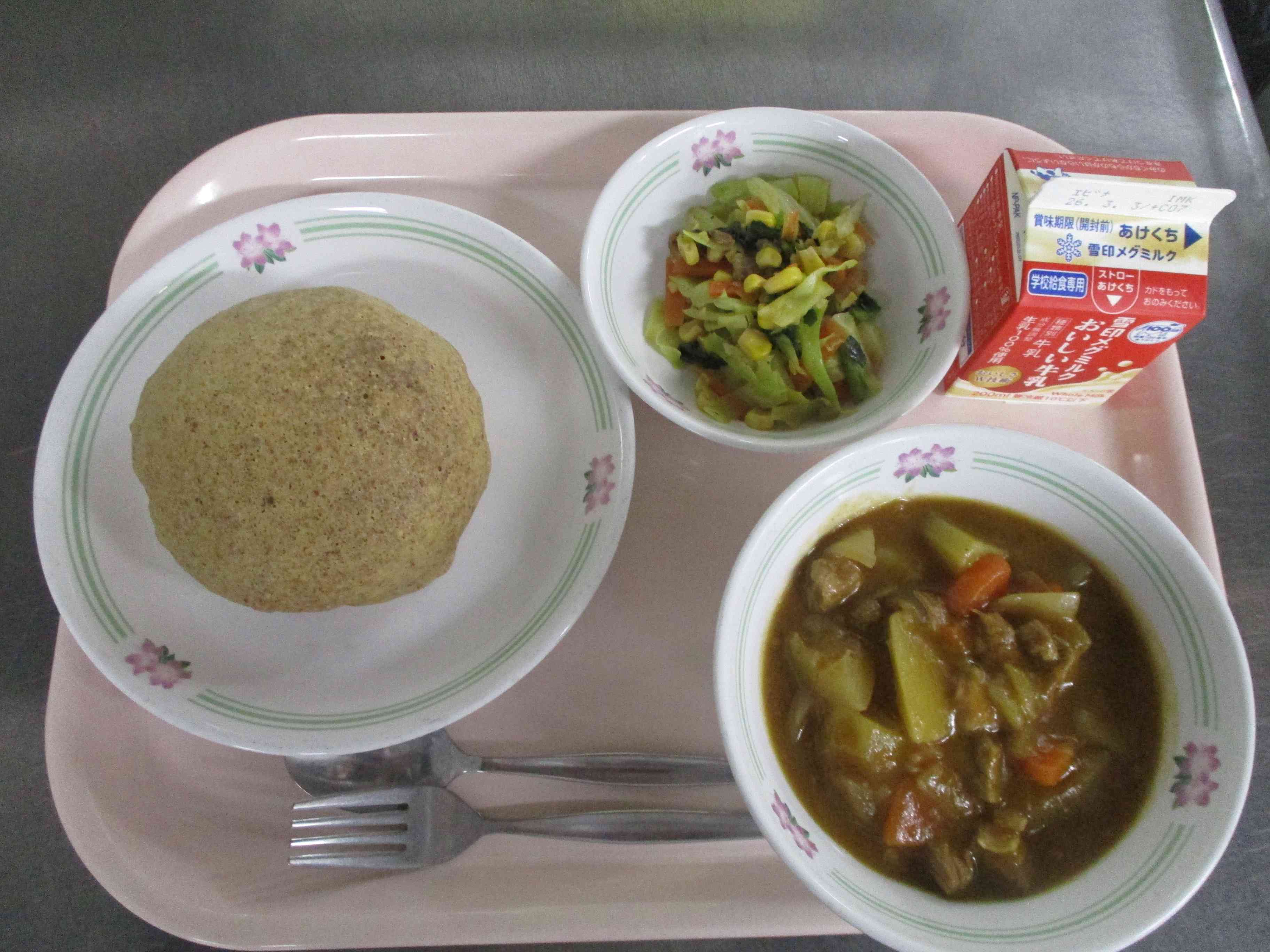 <献立> ・ビスキュイパン ・野菜ソテー ・ポークシチュー ・牛乳 <主な食材産地> 豚肉(茨城)鶏ガラ(岩手)豚骨(茨城)たまご(青森)じゃがいも(北海道)キャベツ(愛知)小松菜(東京)たまねぎ(北海道)にんじん(熊本)にんにく(青森)牛乳(神奈川、千葉、栃木、群馬、宮城、山形、秋田、岩手、静岡、新潟、富山、北海道)