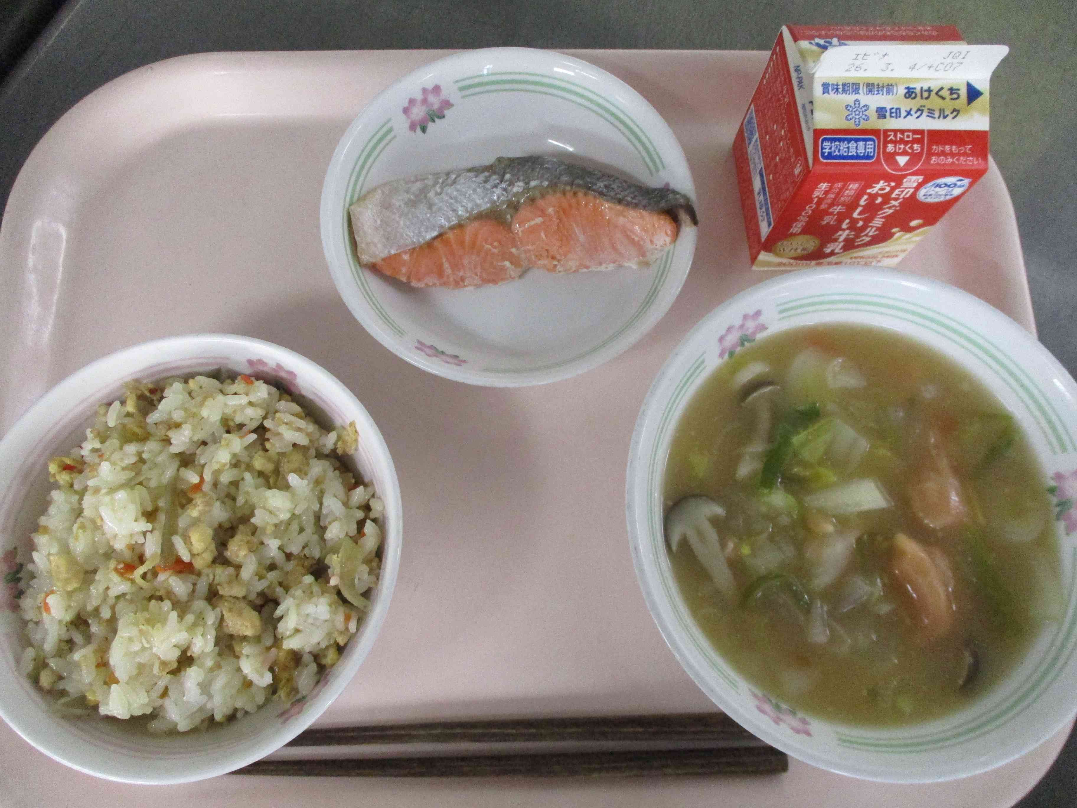 <献立> ・びりんめし ・魚の塩焼き ・トマトだご汁 ・牛乳 <主な食材産地> 鶏肉(岩手)切り干し大根(宮崎)鮭(宮城)ごぼう(青森)大根(静岡)トマト(愛知)にんじん(熊本)ねぎ(千葉)白菜(群馬)しめじ(長野)牛乳(神奈川、千葉、栃木、群馬、宮城、山形、秋田、岩手、静岡、新潟、富山、北海道)